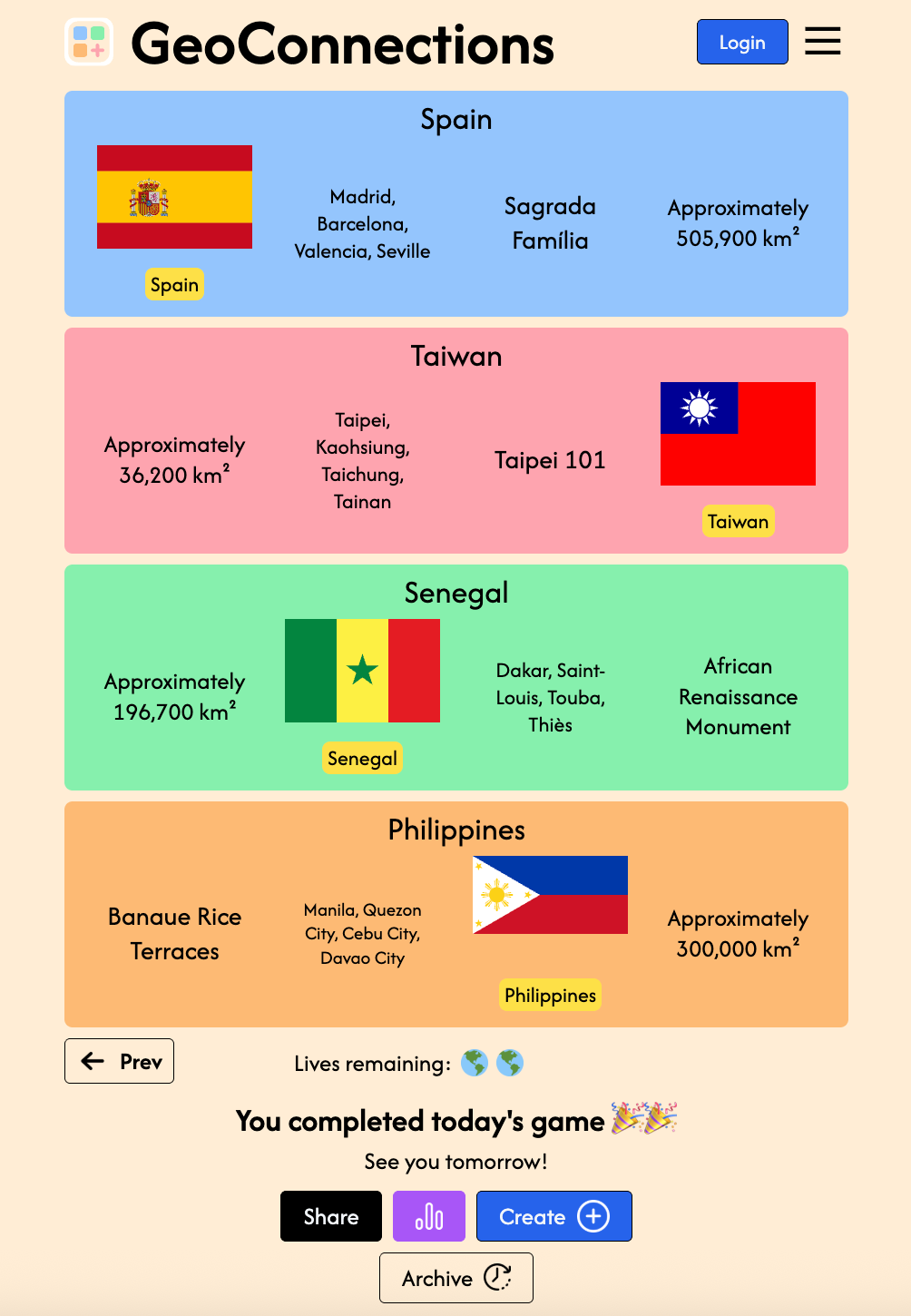 If you like the Connections game, and if you’re a geography geek like me, check out GeoConnections. It’s a daily geography puzzle where you find the common bonds between random clues—and the answers are always geographic. Here’s a recent (correctly solved!) puzzle to illustrate…